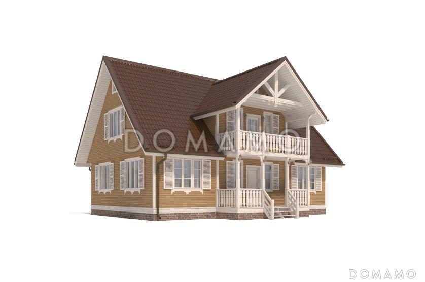 Проект каркасного дома с тремя спальнями на мансарде и одной на первом этаже — доступное решение для обустройства загородного дома семьи из 4-5 человек. Здание облицовано деревянной вагонкой и имеет двускатную крышу. Передний фасад украшает гармоничное сочетание изящного крыльца и балкона над ним. Элементы ограждений, затейливые наличники и ставни на окнах придают дому идиллический вид и уют.