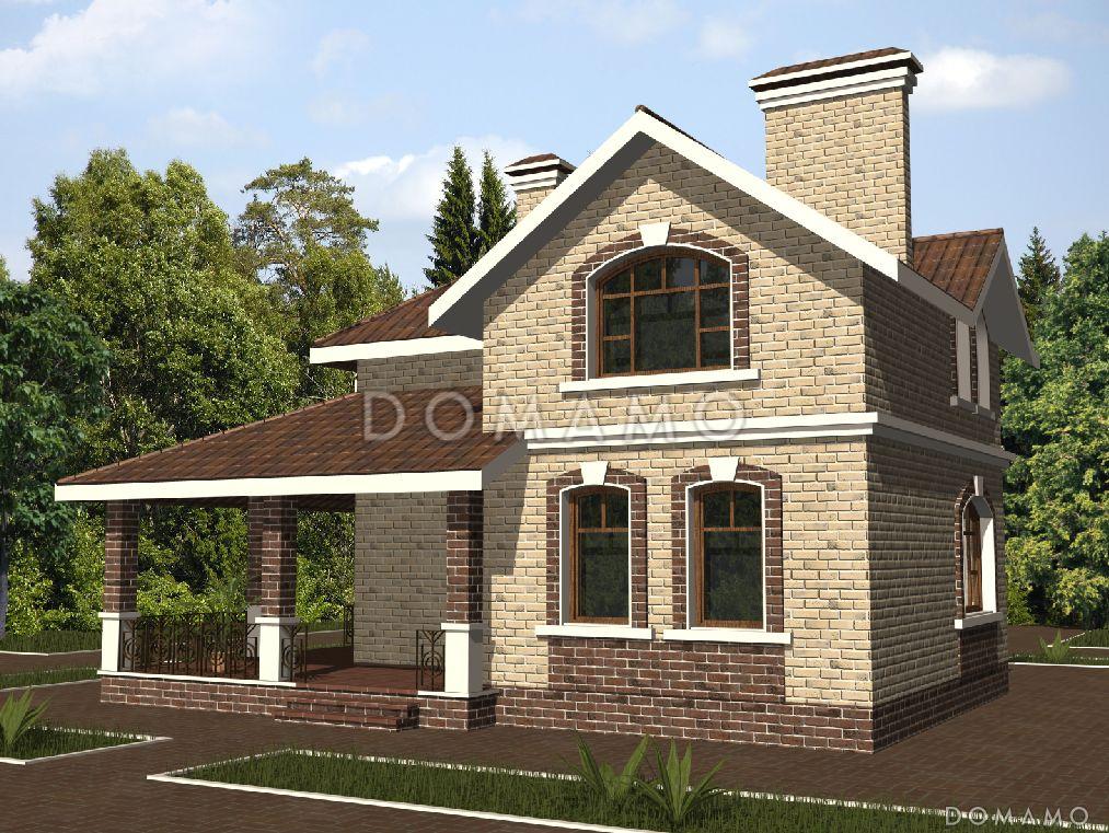 Компактный кирпичный дом с мансардой подойдет для загородной жизни семьи из 3-4 человек. Входная группа представляет собой угловую крытую террасу с двумя входами: в прихожую и напрямую в гостиную.