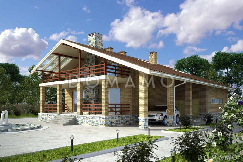 Кирпичный двухэтажный коттедж площадью 318 кв.м подойдет для семьи из 4-5 человек. С двух сторон здание украшают габаритные террасы и балконы с яркими деревянными ограждениями.