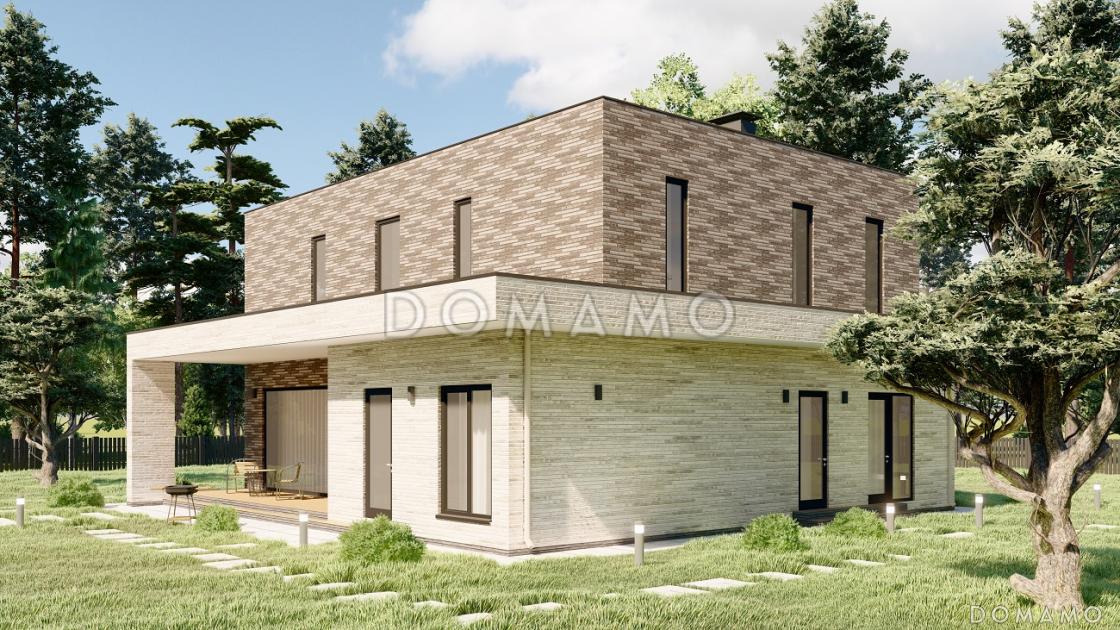 Дом оформлен в современном стиле, черты которого проявляются в использовании плоской кровли и необычной отделке фасада. Архитекторы позиционируют этот дом как место для постоянного проживания или отдыха на природе. Владельцы коттеджа оценят огромные окна в гостиной, которые наполняют это помещение светом.