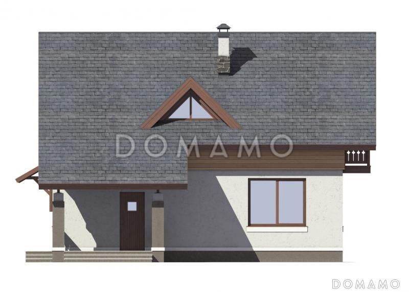 Миниатюрный дом для семьи из трех-четырех человек. Отделка фасада разнородна: внизу — штукатурка, наверху — деревянная вагонка.