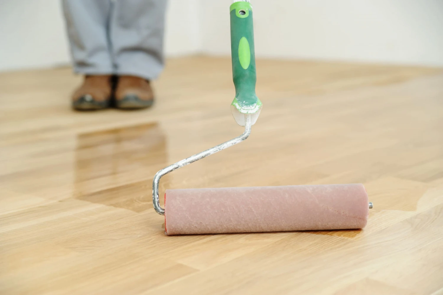 Перед покраской лаком пол обрабатывают нитролаком, который аккуратно наносят вдоль волокон древесины.