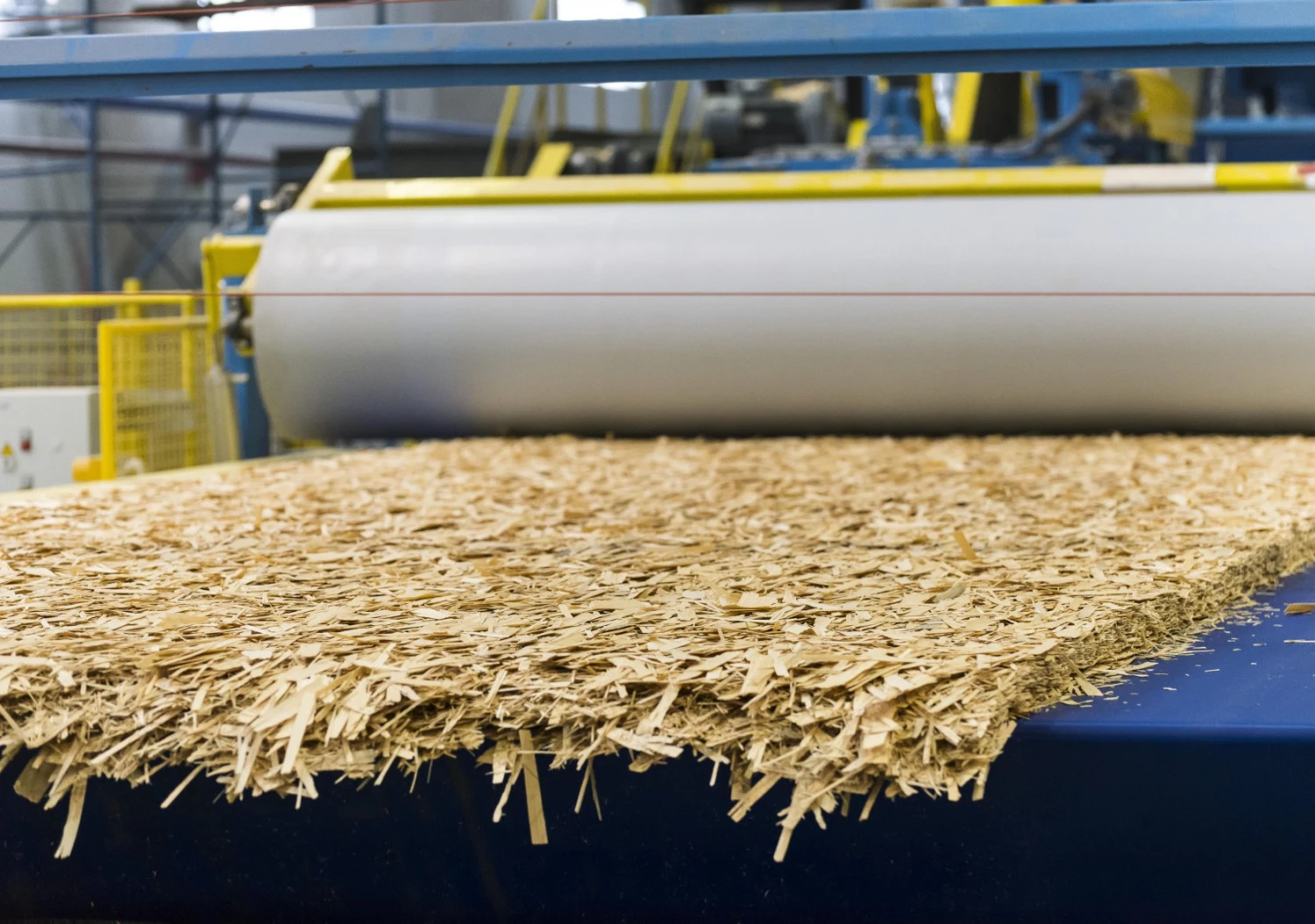 Рыхлый массив щепы в смеси с клеем идет под пресс. Процесс сопровождается нагревом для того, чтобы обеспечить полимеризацию смол. После остывания на внешнюю поверхность и на торцы плит наносят защитное покрытие — мастику или лак. Оно нужно не только для повышения влагостойкости, но и уменьшения эмиссии ядовитых веществ в атмосферу.