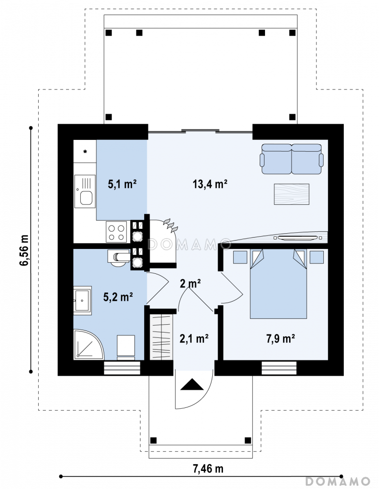 Компактные размеры домика для гостей необходимо использовать по максимуму. Благодаря грамотному проектированию на отведённой площади можно с комфортом разместить 2–6 человек. Если строение планируют для временного проживания, жилое пространство расширяют за счёт габаритов комнат технического назначения.