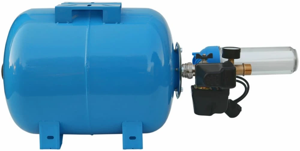 Оборудование поверхностного типа может идти вместе с баком (в таком варианте система называется насосной станцией). Объёма в 20–50 л не хватит, чтобы создать значительный резерв воды, необходимый для дома с большим водорасходом. В этом случае речь идёт не о продлении срока службы контура, а о поддержании его работоспособности. Однако для дачного коттеджа на 2–3 человека оборудование водоснабжения из колодца может комплектоваться насосной станцией с баком на 24 л, если основной расход воды идёт на кухонный смеситель и душевую кабину. Если скорость наполнения колодца низкая, а расход высокий, лучше выбрать установку с накопительной ёмкостью большого объёма.