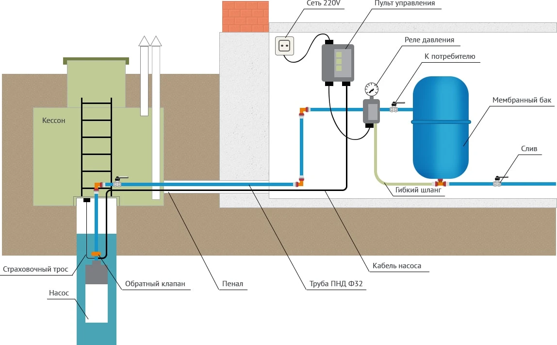 Устройство колодца для подачи воды в дом работает по тому же принципу, что и другие автоматизированные контуры. Для подключения понадобятся: