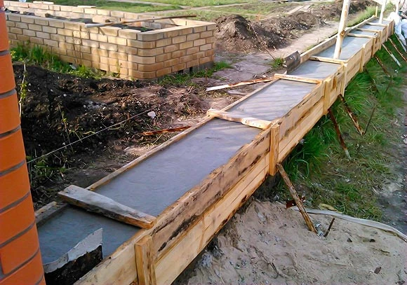 В траншее устанавливают съемную или несъемную опалубку. В нее по всей длине укладывают арматурные пруты. Арматура защитит фундамент от растягивающих нагрузок, значительно упрочняет основание, делает его более стойким к любым типам воздействия.