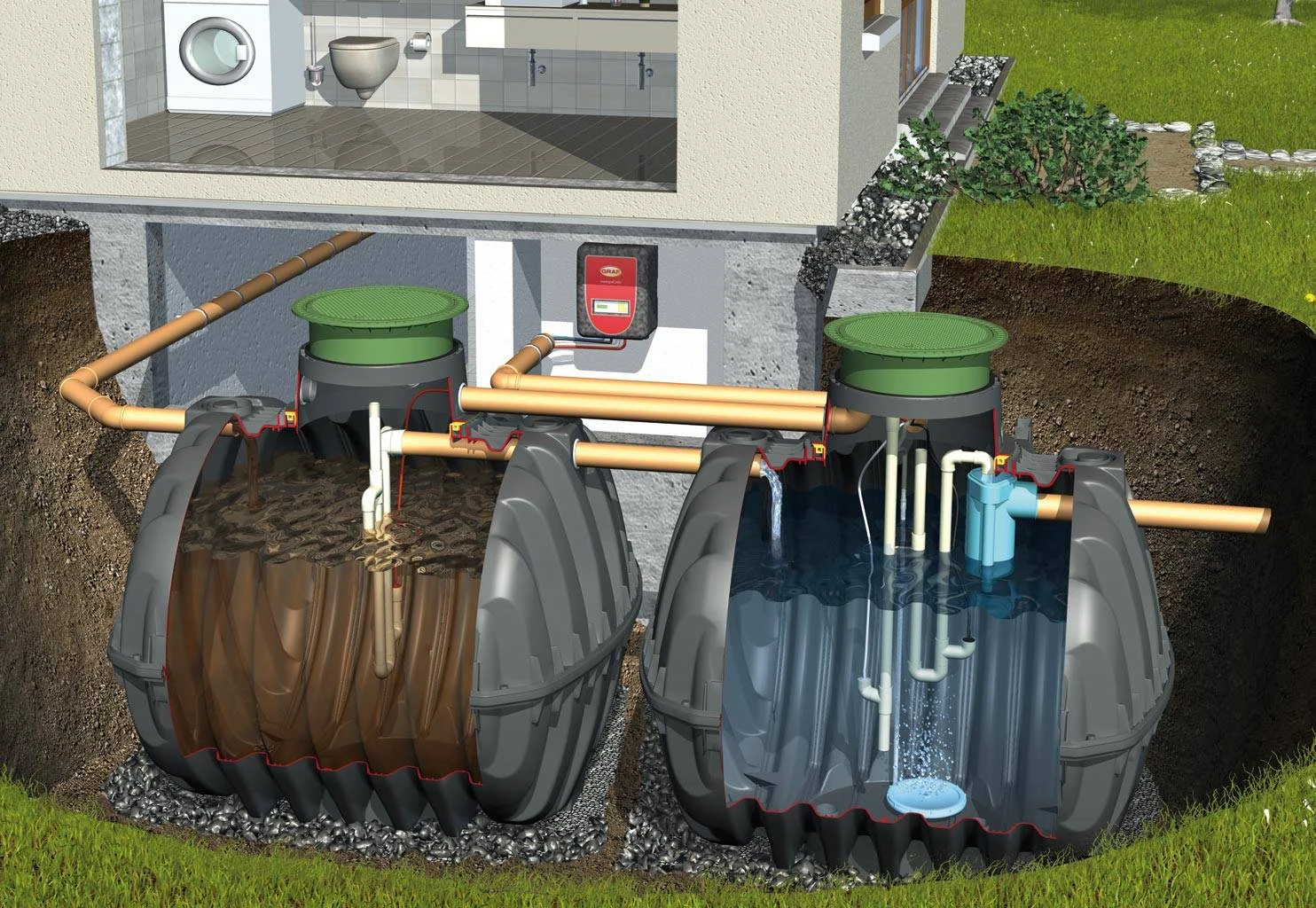 Эта система применяется в случае, если на участке грунтовые воды залегают близко к поверхности. Здесь также присутствует герметичная емкость, где масса разлагается на илистую смесь и воду. Но после очищения жидкость поступает не в резервуар с дренажем, а откачивается насосами на специально оборудованную площадку.