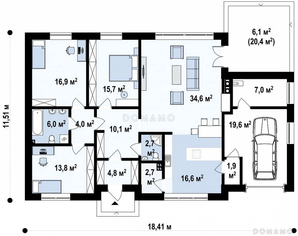 Дом занимает 20% участка. Это означает, что 80% участка остается для ландшафтного дизайна и отдыха.