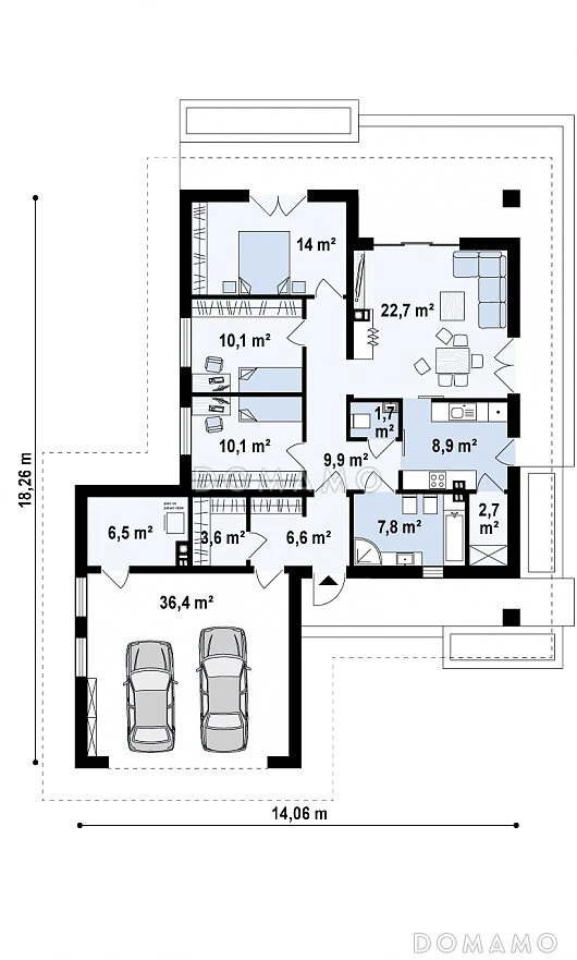 Так дом площадью 100 квадратных метров считается маленьким. Оптимальный дом для 3 человек. Эму свойственны простая и компактная планировка, включающая в себя гостиную, кухню-столовую, две спальни, ванную комнату, прихожую и кладовую. Этот дом занимает 10 процентов участка, оставляя 900 квадратных метров для ландшафтного дизайна.