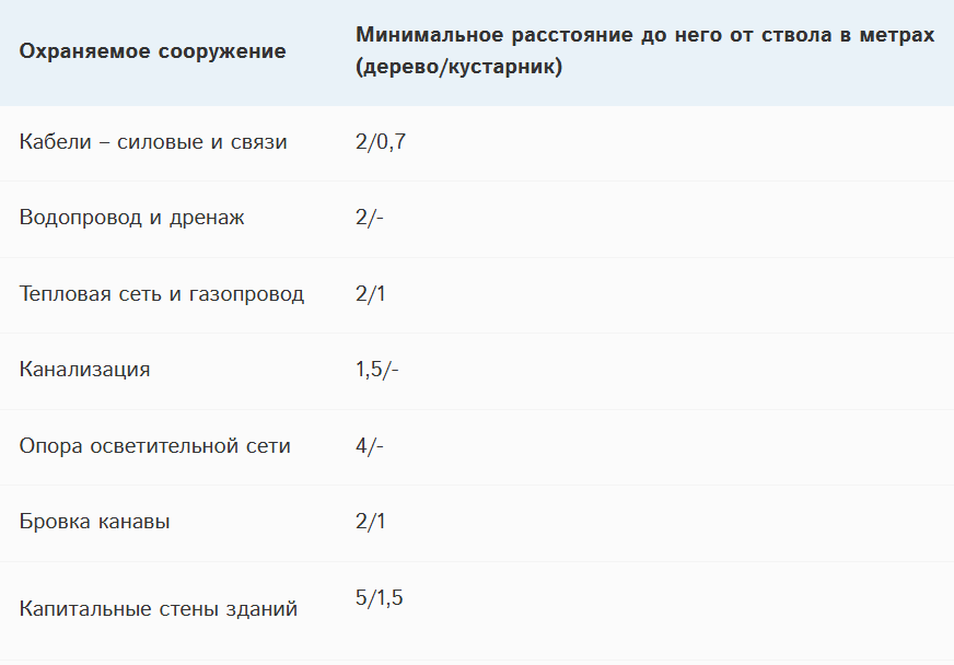 Наиболее жестко вопрос о высадке деревьев и кустарников регламентируется в части, касающейся вероятного повреждения ими различных магистралей — не только федерального, но и местного значения. Для удобства восприятия мы свели их в таблицу.