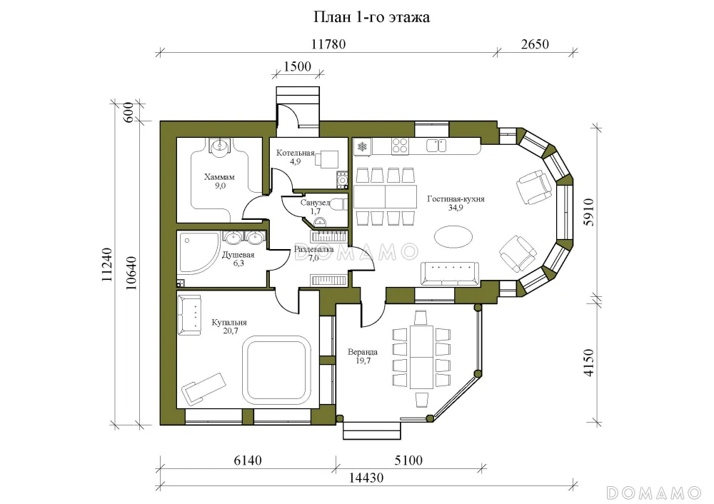 Веранда или терраса рассчитываются индивидуально, обычно их размещают на остатках площади фундамента.
