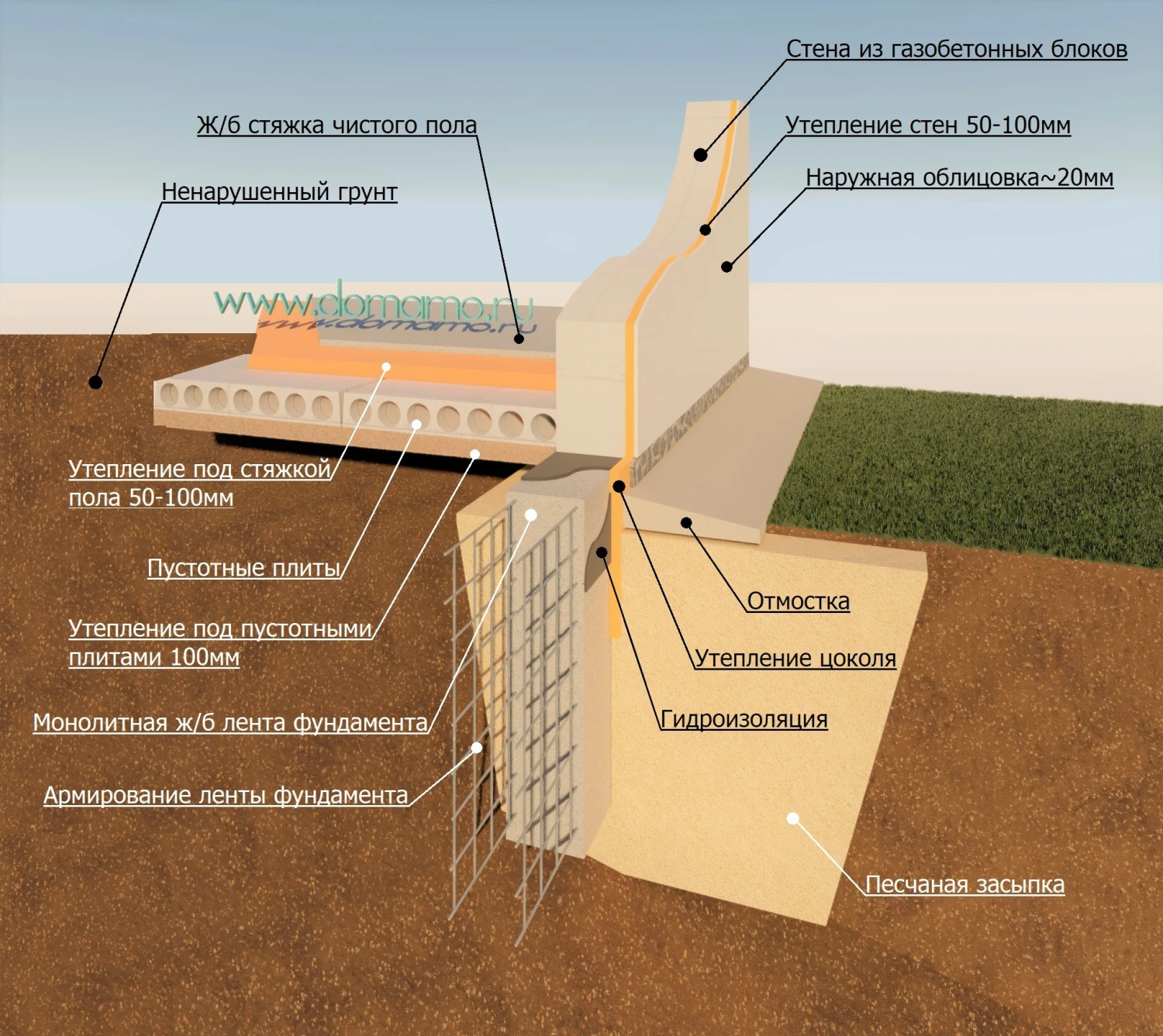 Расчет материалов для ленточного фундамента производится с учетом периметра дома и количества внутренних перегородок. Важно подобрать подходящие материалы для тепло- и гидроизоляции основания, чтобы предотвратить его размывание.