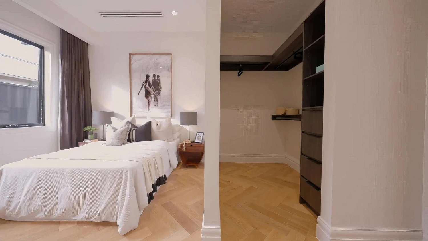 Спальная комната с примыкающей к ней ванной, санузлом и гардеробной.