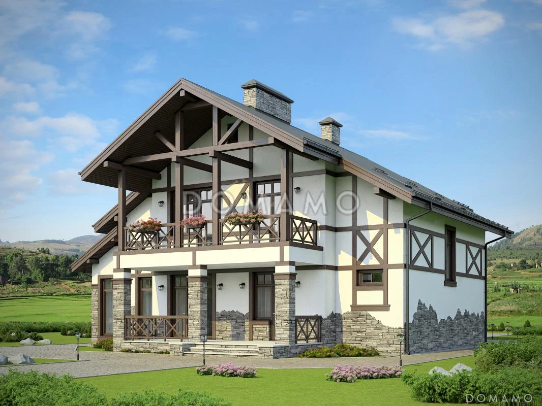 Можно создать дом в стиле шале, используя для отделки породу разного размера. Снизу лучше разместить булыжники крупной фракции, верхний этаж можно оформить при помощи древесины.