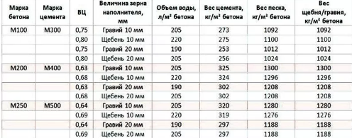Кроме этого, при выборе учитывают предполагаемую нагрузку на основание. Количество мешков цемента на один куб бетона зависит от его марки.
