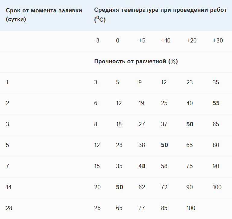 Сроки, выделенные жирным шрифтом, это как раз те моменты, когда вы можете считать все конструкции достаточно прочными для восприятия нагрузки.