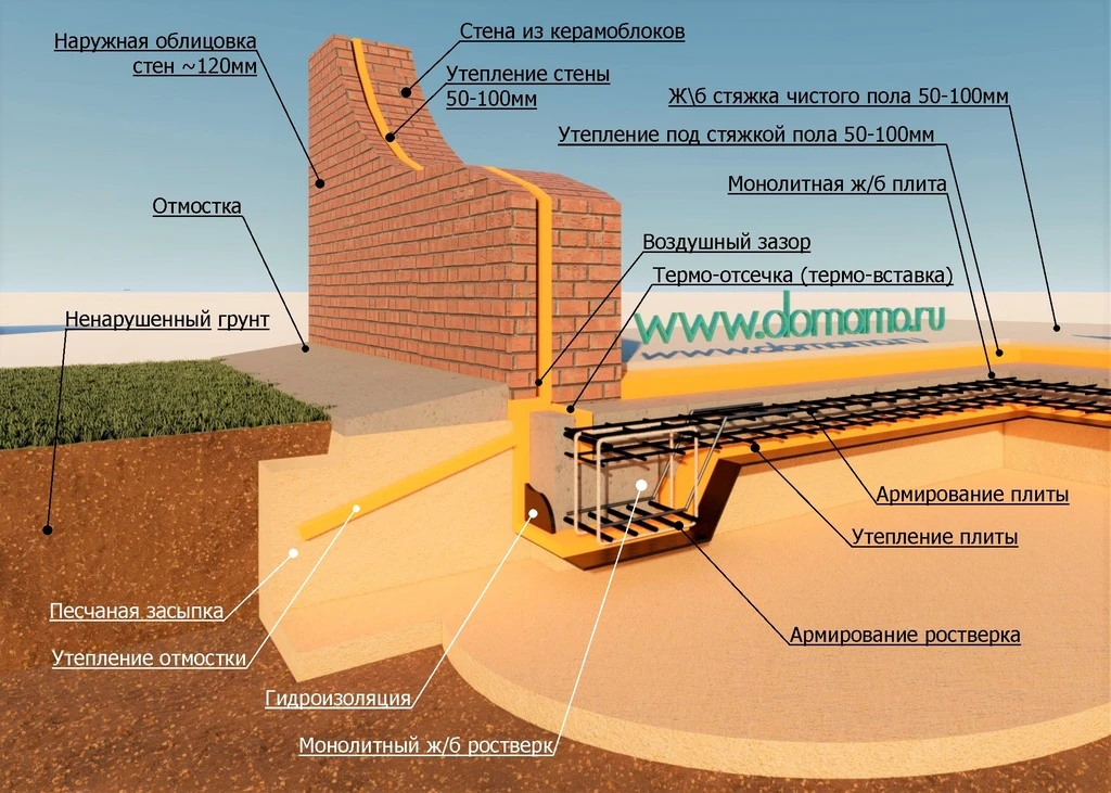 Они представляют собой бетонный массив, контур которого повторяет периметр капитальных стен, а также пристроек к дому. Например, веранд или террас. Закладываются на глубину от 50 до 70 см. Бывают двух видов:
